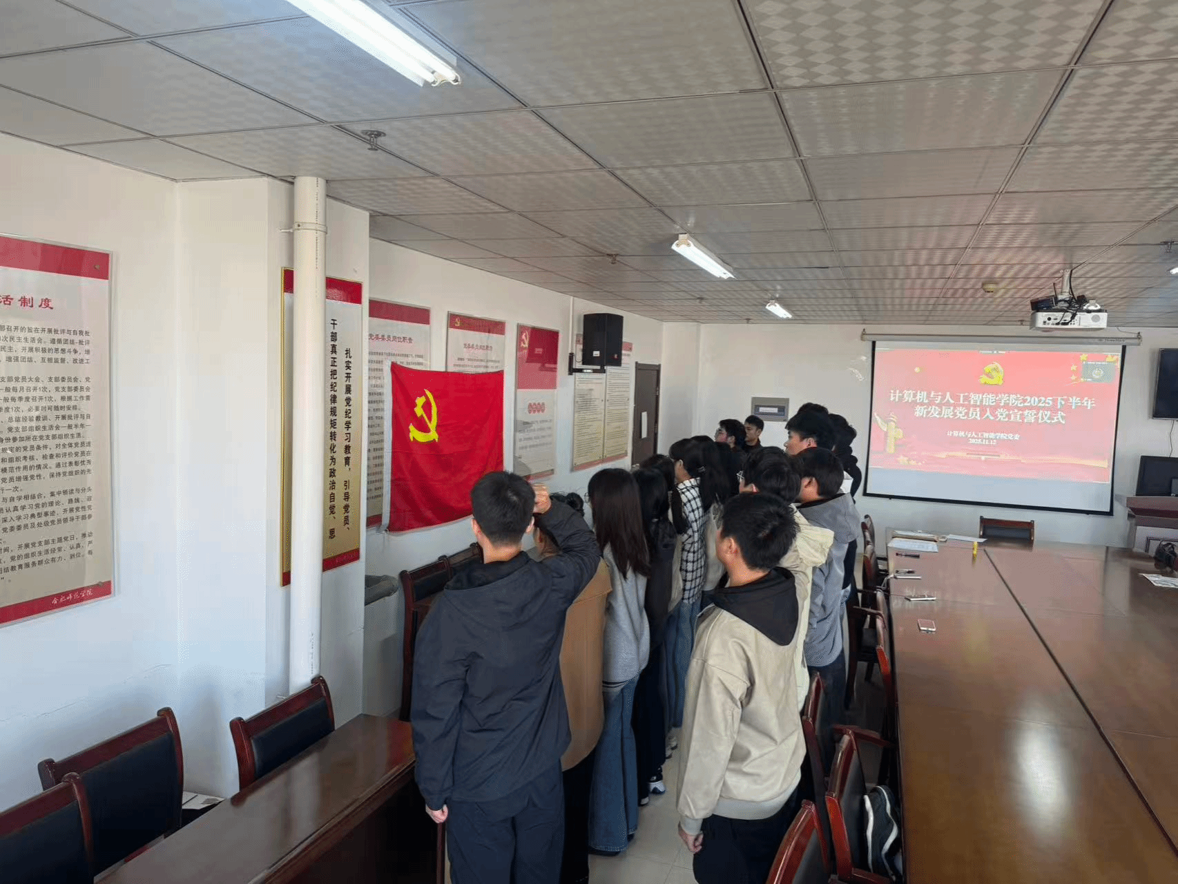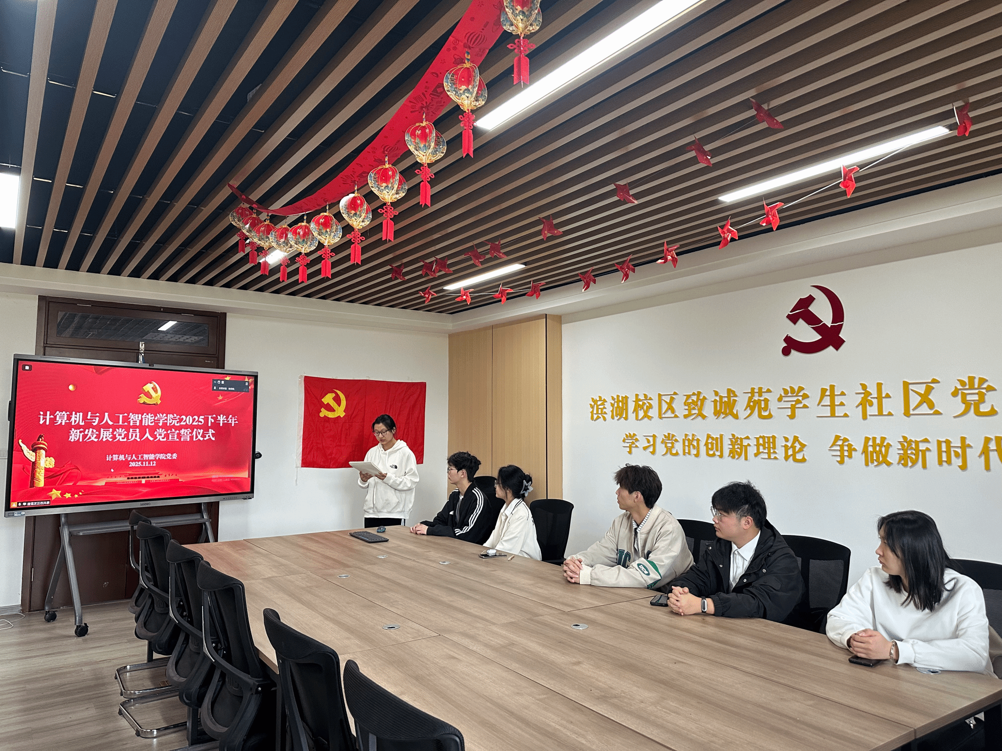 为进一步强化党员政治意识,增强党员责任感和使命感,11月12日,计算机与人工智能学院在行知楼1302会议室和滨湖校区一站式社区同步举行2025年度下半年新党员入党宣誓仪式。各学生党支部书记、全体党员出席本次宣誓仪式。