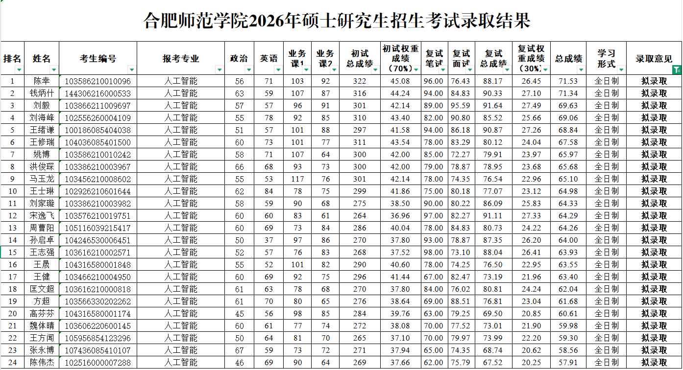 计算机与人工智能学院2026年硕士研究生招生复试(调剂)拟录取结果